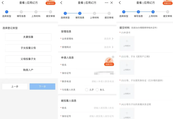 以“省外迁入”为例,根据实际情况选择登记类型,这里以“子女投靠父母”为例,点击“下一步”,按要求填写受理信息、申请人信息及被投靠人信息,填写完成后点击“下一步”,并上传提交“申请书、父母、子女户口本”等照片材料即可。