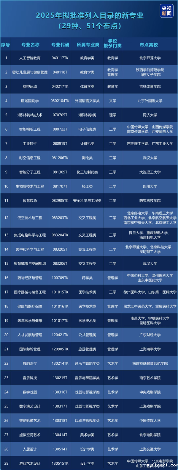 4月22日,教育部发布2025年普通高校本科专业目录,公布最新本科专业备案和审批结果,共增设29种本科新专业,纳入2025年高考招生,并首次建立战略急需专业超常设置机制。
