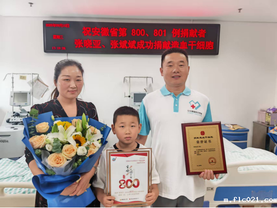 安徽省第800例造血干细胞捐献者在安徽合肥一家医院成功采集造血干细胞,为远方一位素未谋面的血液病患者送去了生的希望。9月10日,安徽省红十字会党组书记、专职副会长许伏新,宿州市红十字会常务副会长杨玉洁,县红十字会常务副会长王浩来到合肥一家医院,看望正在造血干细胞捐献的张晓亚,向他送上鲜花和慰问金,并对其无私奉献、挽救他人生命的善举表示崇高敬意。